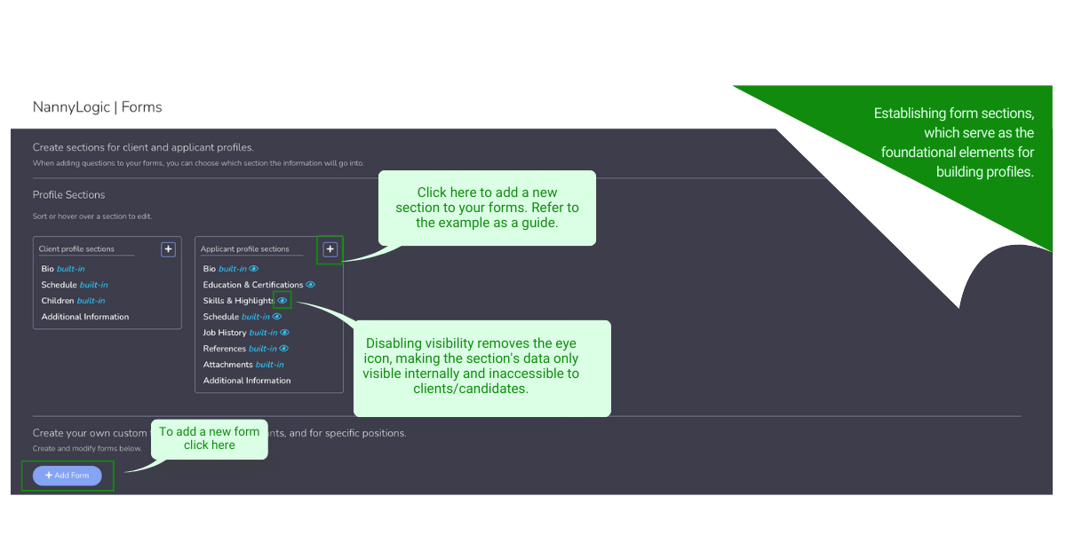 - Create sections for client and applicant profiles under “Profile Sections”
