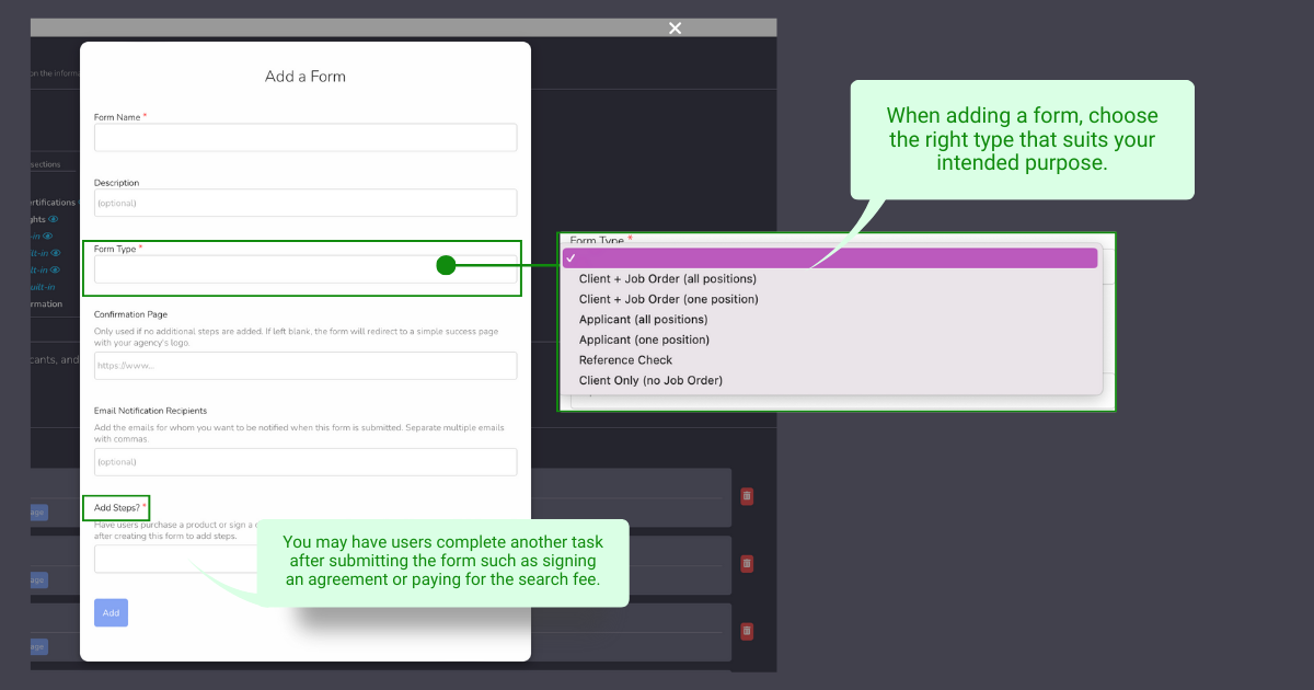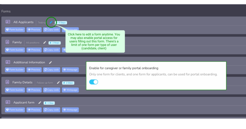 NOTE: To enable portals please go back to the form main page and click on the pencil icon to edit the form. Check the portal enabling option. Please note you may only have one portal per client form and one per candidate.