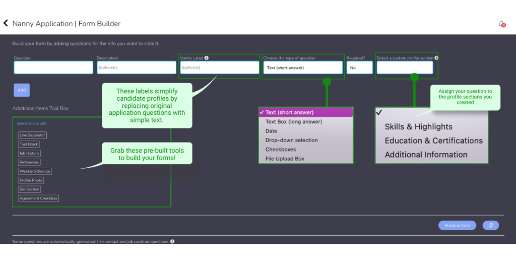 - The form builder mode will load and you may start adding your questions to the form. On the top of the page, you will have your question tools and your “Additional Items Tool Box“. The Items Tool Box contains drag-and-drop values/pre-built questions and it differs from the client and candidate form building information.