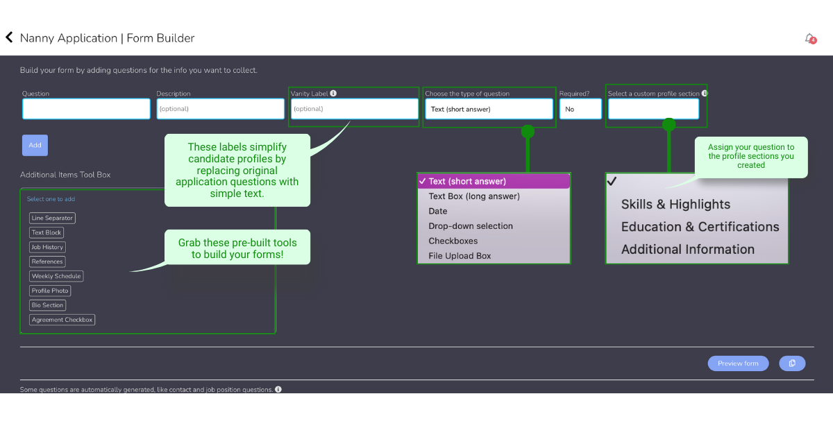 Begin by establishing form sections, which serve as the foundational elements for building profiles. When candidates respond to questions within the application or other forms, assigning the appropriate section labels to the questions ensures that the answers are systematically populated within the candidate’s profile, maintaining organization and aligning with the relevant profile sections.