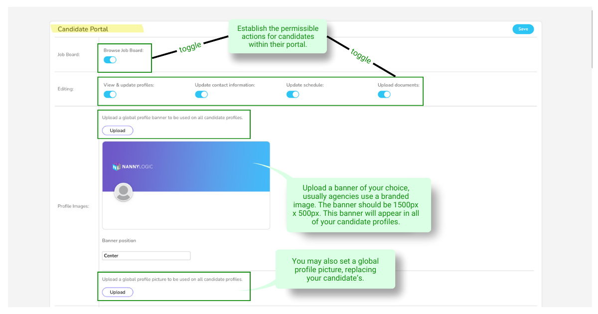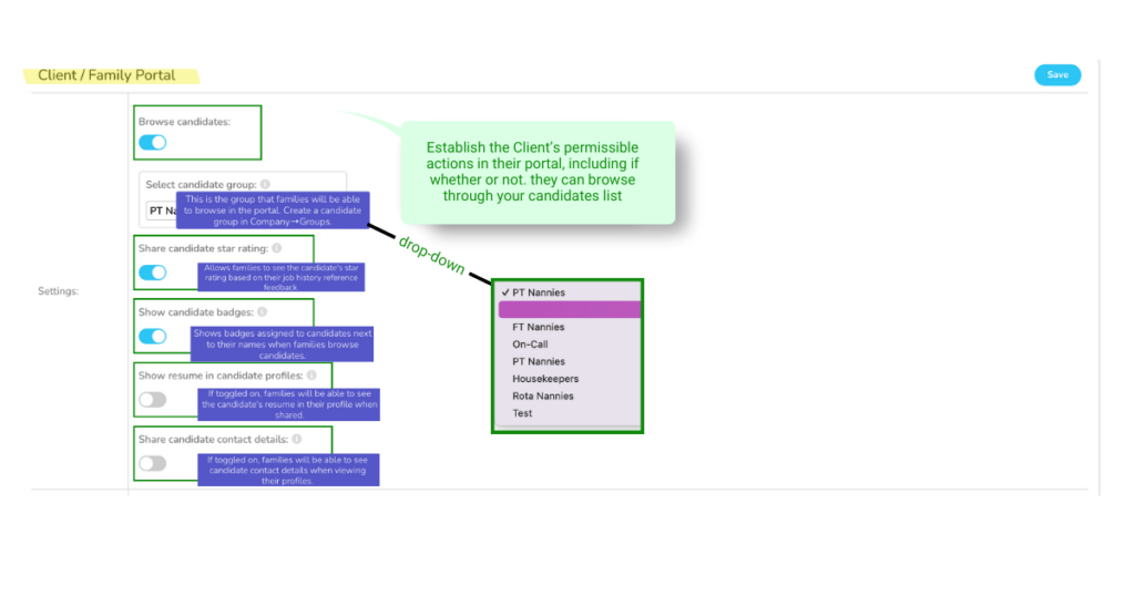 In Company > Settings > Portal, customize accessibility and visibility settings for candidates and clients. Options include enabling/disabling the job board, updating schedules, and document uploads.