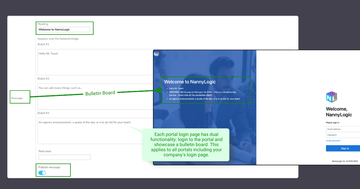 Use your login page as a bulletin board! Announce events, celebrate, inspire, or just simply give direction. Please note that each portal, including your company’s, has different login pages and, therefore separated bulletin boards so you may transmit your message to that specific group such as clients, candidates, or your company.