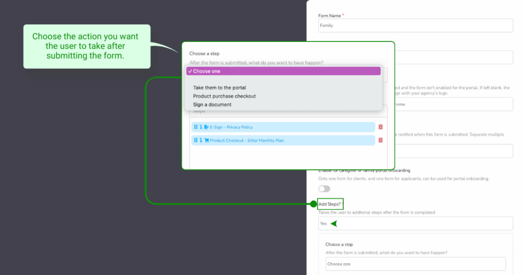 There is another way to automate even further. Have users purchase a product, go to their portal to register, or sign a document after form submission by adding steps. Click the pencil after creating the form to add steps.