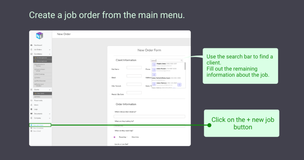 The first method involves adding a job order directly from the client’s profile. To do this follow these steps: