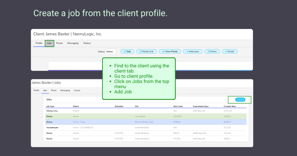 - Navigate to the client’s profile and locate the Jobs tab from the top menu.