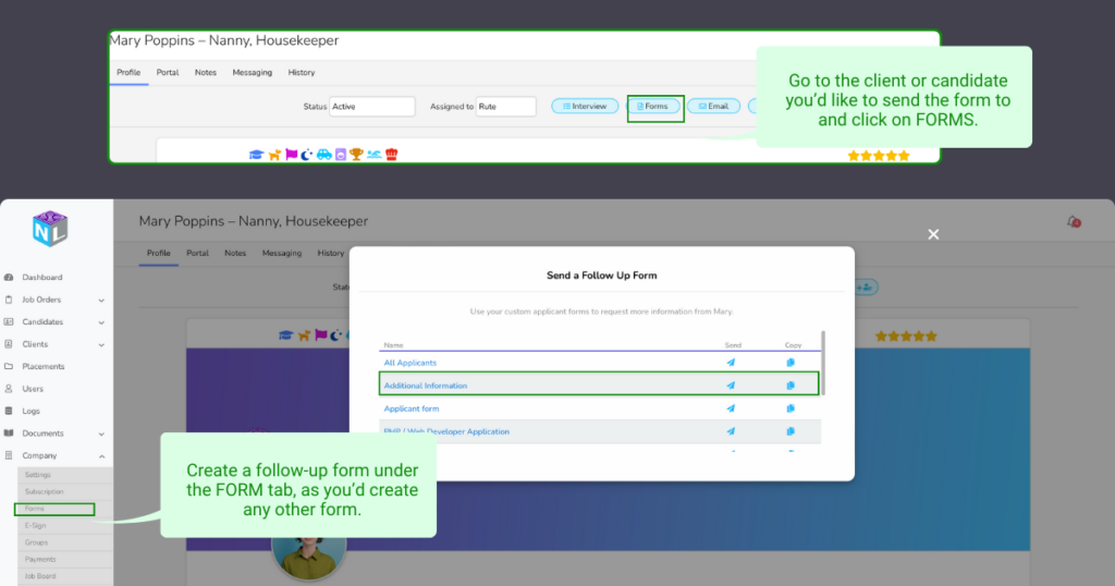 Start by creating a form under “Company” > “Forms”. Once your form is created, you should send this form directly from the candidate or client’s profile so the system may populate the data into the correct profile. To send the follow-up form simply navigate to someone’s profile and click on the “Forms” button located at the top of the page.