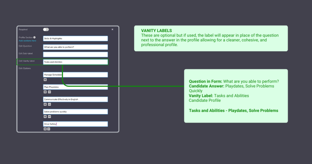 Vanity Labels streamline candidate profiles by substituting original application questions with concise text. These labels automatically retrieve information from the candidate’s application, eliminating the need for redundant data entry and simplifying the introduction of candidates. When building a form, vanity labels are conveniently positioned next to each question. Opting out of this feature will display the form’s original question.