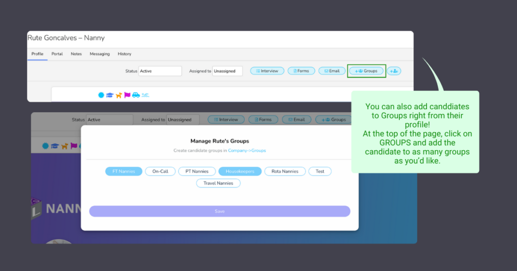 Once groups are created, you can then use the groups button located at the top of the candidates profile to add them to the desired groups.