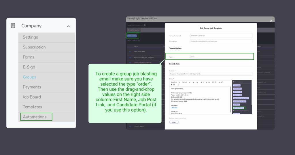 >Enter template name e.g. Job Blast, Subject e.g. “Check out this job” and the text. Please make sure to use the drag and drop values: “{{job_post_link}} and {{candidate_portal_link}}.