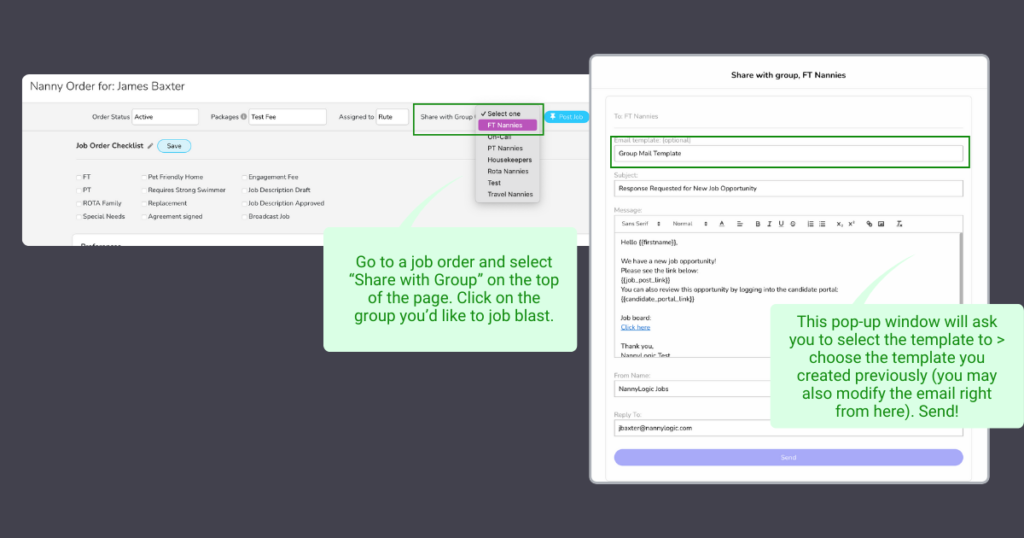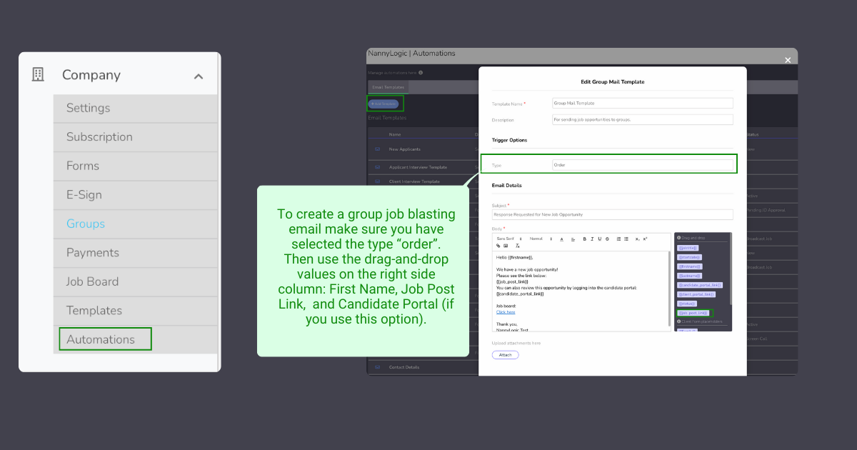 e.g. On Call Job Created > Send to On-Call Nannies