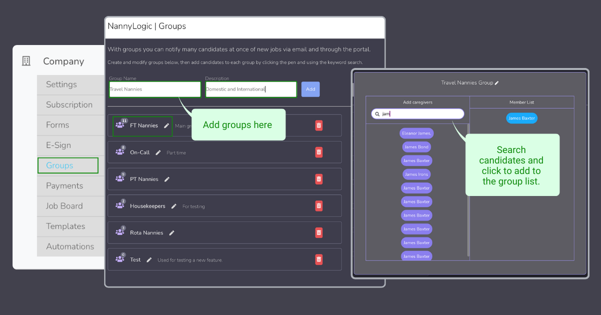 The way that groups work is by adding candidates to specific groups created by you so the system knows who to send the information to.