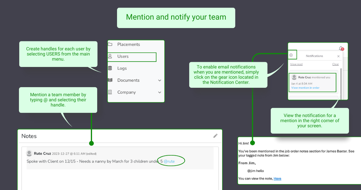 This feature simplifies communication by allowing you to mention your team members under relevant notes in job orders, candidate profiles, and client interactions.