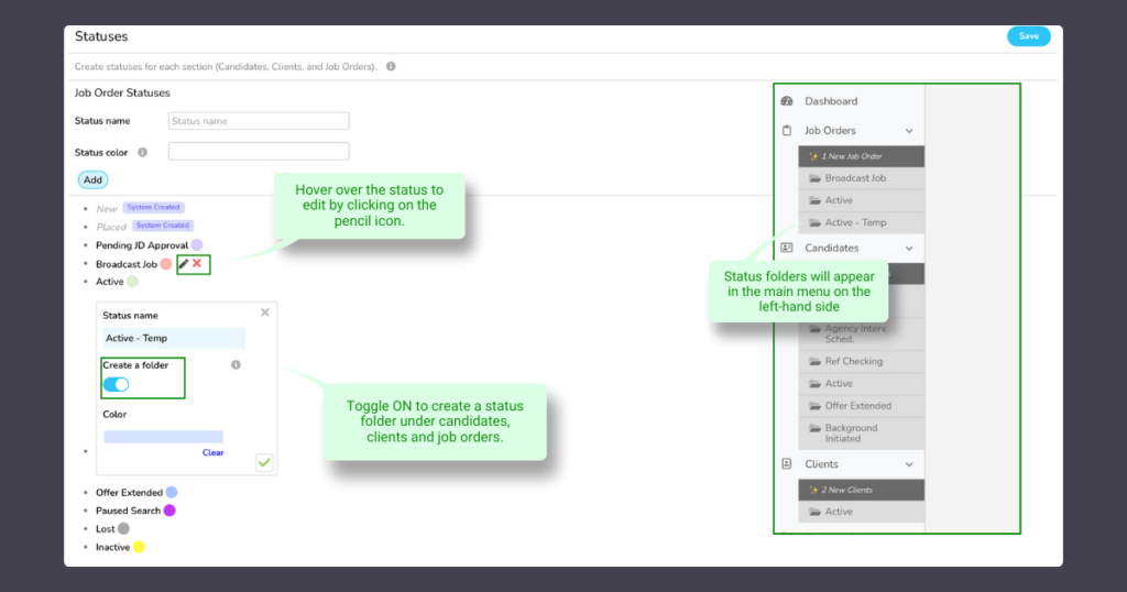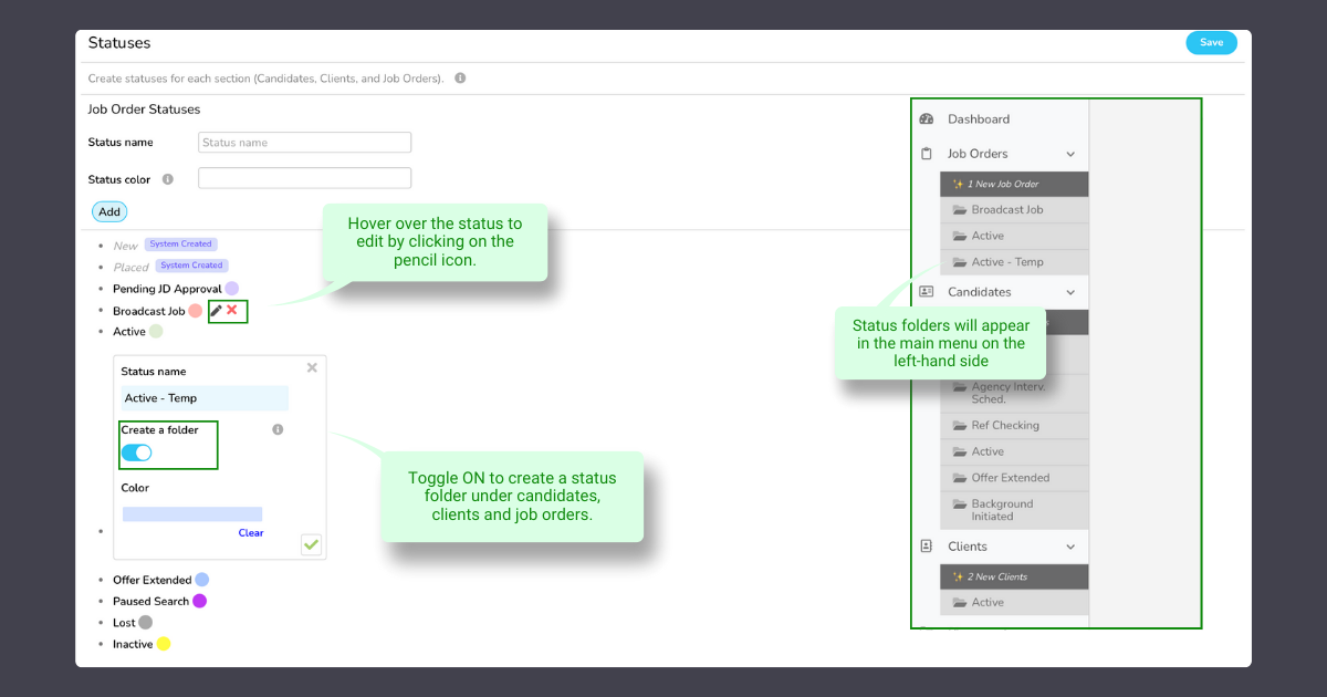 - Statuses (select which tab you’d like to add statuses folders: candidates, job orders or clients)
